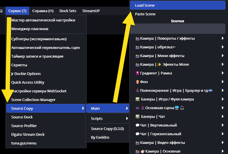 - После установки плагина запусти OBS и перейди в меню «Сервис». Если всё было сделано правильно, там появится пункт Source Copy