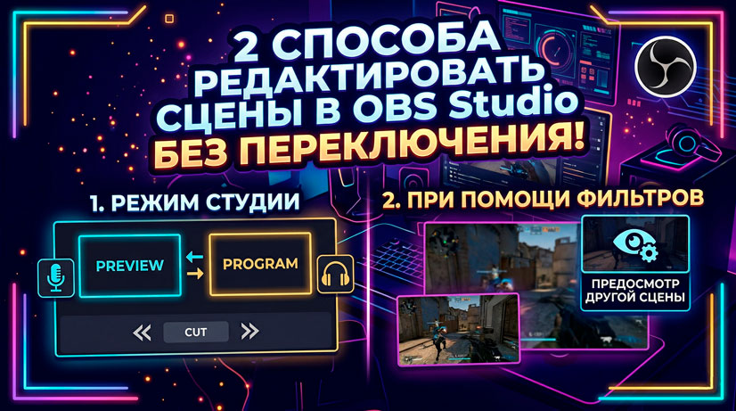 В этом видео, покажу два способа как в OBS можно редактировать сцену: не переключая ее и переключая но так, чтоб вы видели сцену которую хотите отредактировать. Первый вариант - при помощи режима Студии (не переключая сцены) Второй вариант - при помощи фильтров